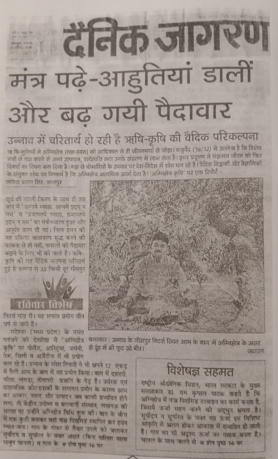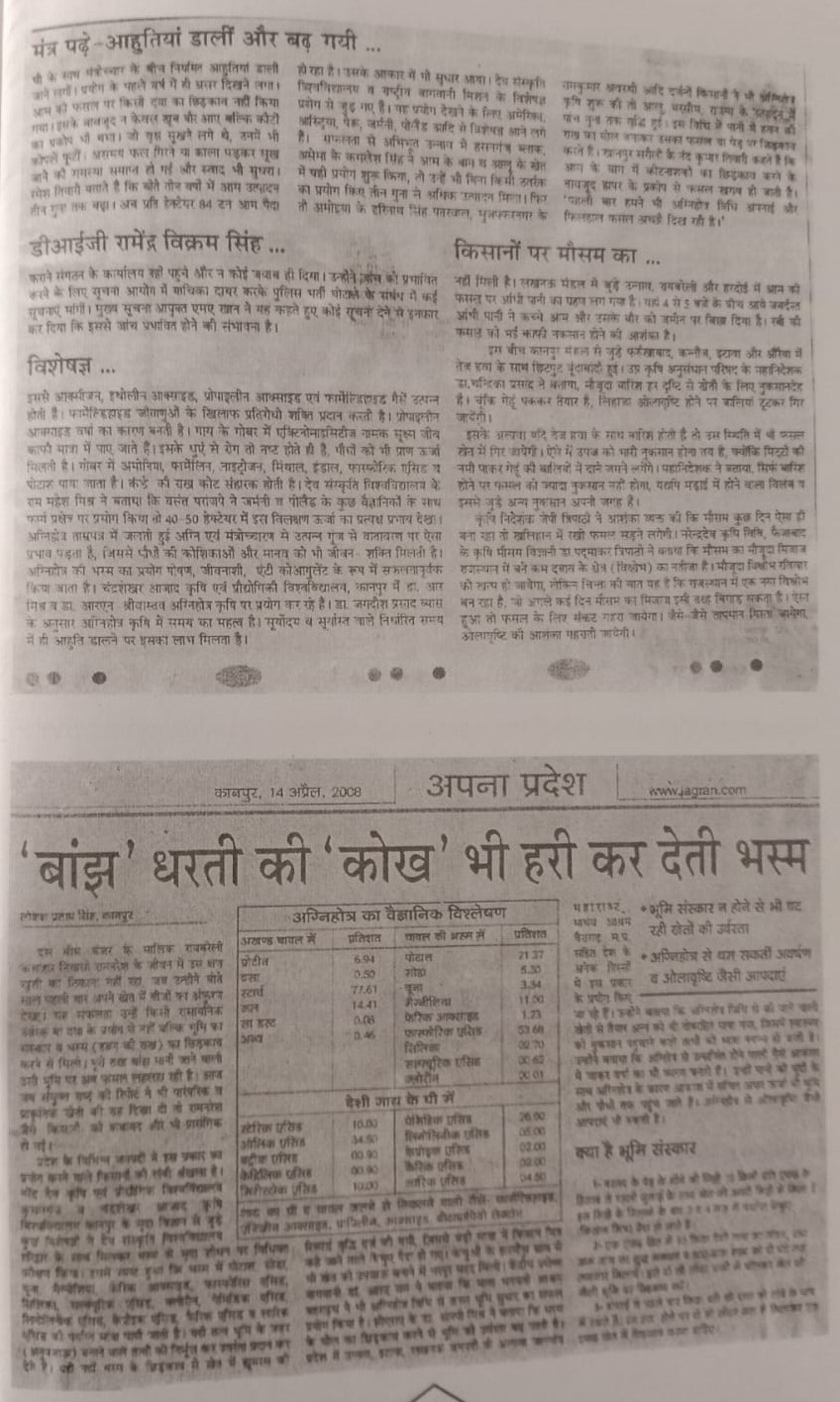 Dr. Potdar and his associates practised agnihotra farming since last 30 years at Madhavashram, Bhopal. Several crops like wheat, gram, soybean, vegetables like tomato, brinjal, lady fingers, potato, onion and cucurbits were grown in the farm of about 10 acres without using any chemical fertilizers, pesticides insecticides and weedicides. Recently a garden including mango guava, aonla, papaya, citrus has been developed following the ideal practices of agnihotra farming.